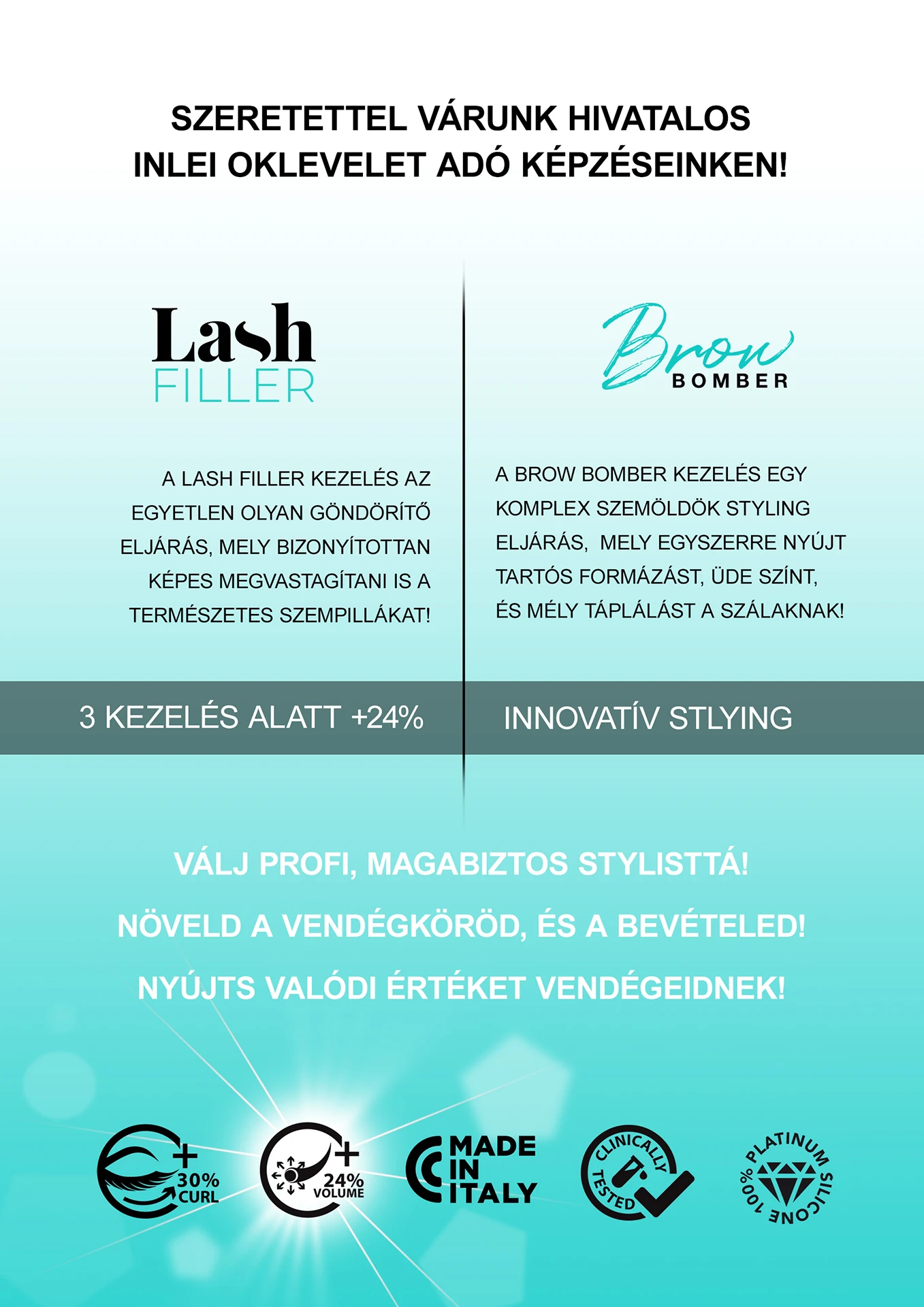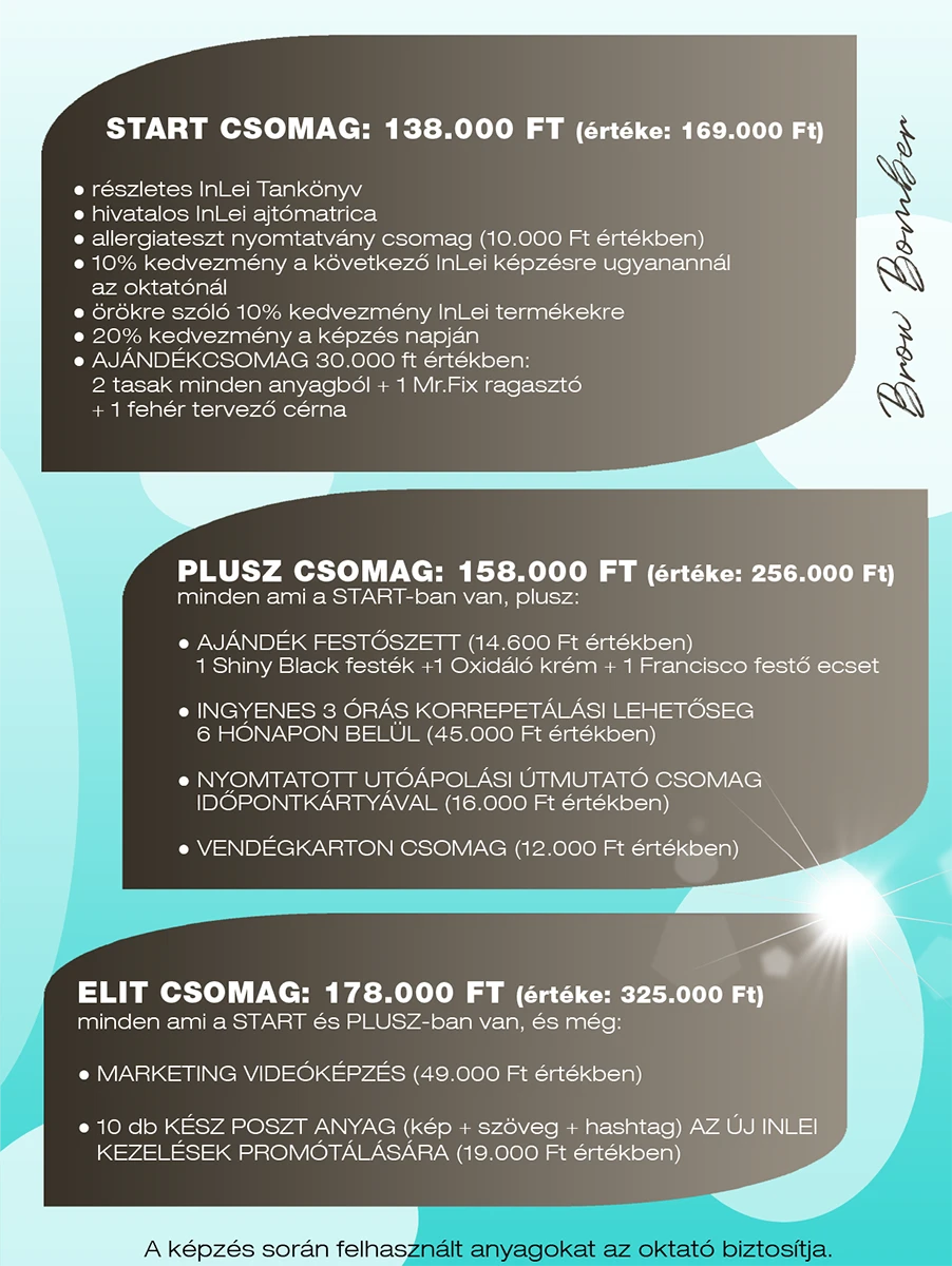 A legfontosabb számomra, hogy képzéseimen valóban használható és értékes tudást kapj, amivel értéket tudsz teremteni, elégedett vendégkört tudsz építeni. Emellett fontosnak tartom, hogy olyan gyakorlatorientált oktatásaim legyenek, amelyek után nem marad benned kérdés és sikeresen tudod elkezdeni önálló karrieredet. A tanfolyam után is állok rendelkezésedre bármilyen szakmai kérdésben. A képzések felnőttképzési rendszerben bejelentett képzések, melyekről az InLei® által kiállított hivatalos oklevelet adok.