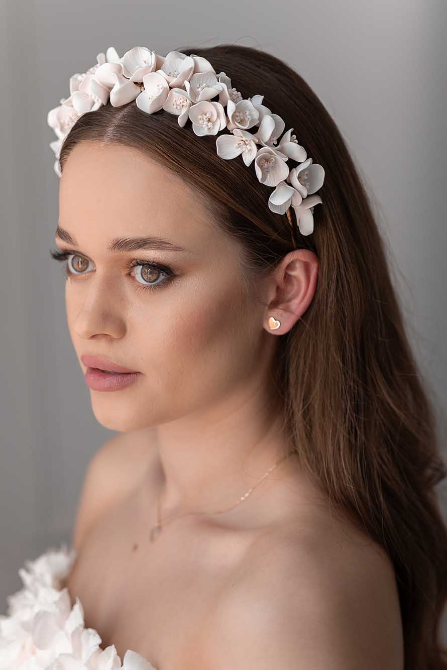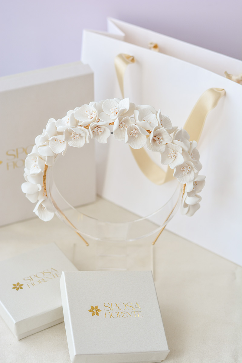 A Chiara hajpánt szépségét és egyediségét a porcelán virágok és Preciosa R üveggyöngyök adják. A hajdísz alapja egy rugalmas hajpánt, mely bármilyen fej méretre megfelelő. A felhasznált virágok minden egyes szirma egyedileg, kézzel készül rendkívüli odaadással és figyelemmel.