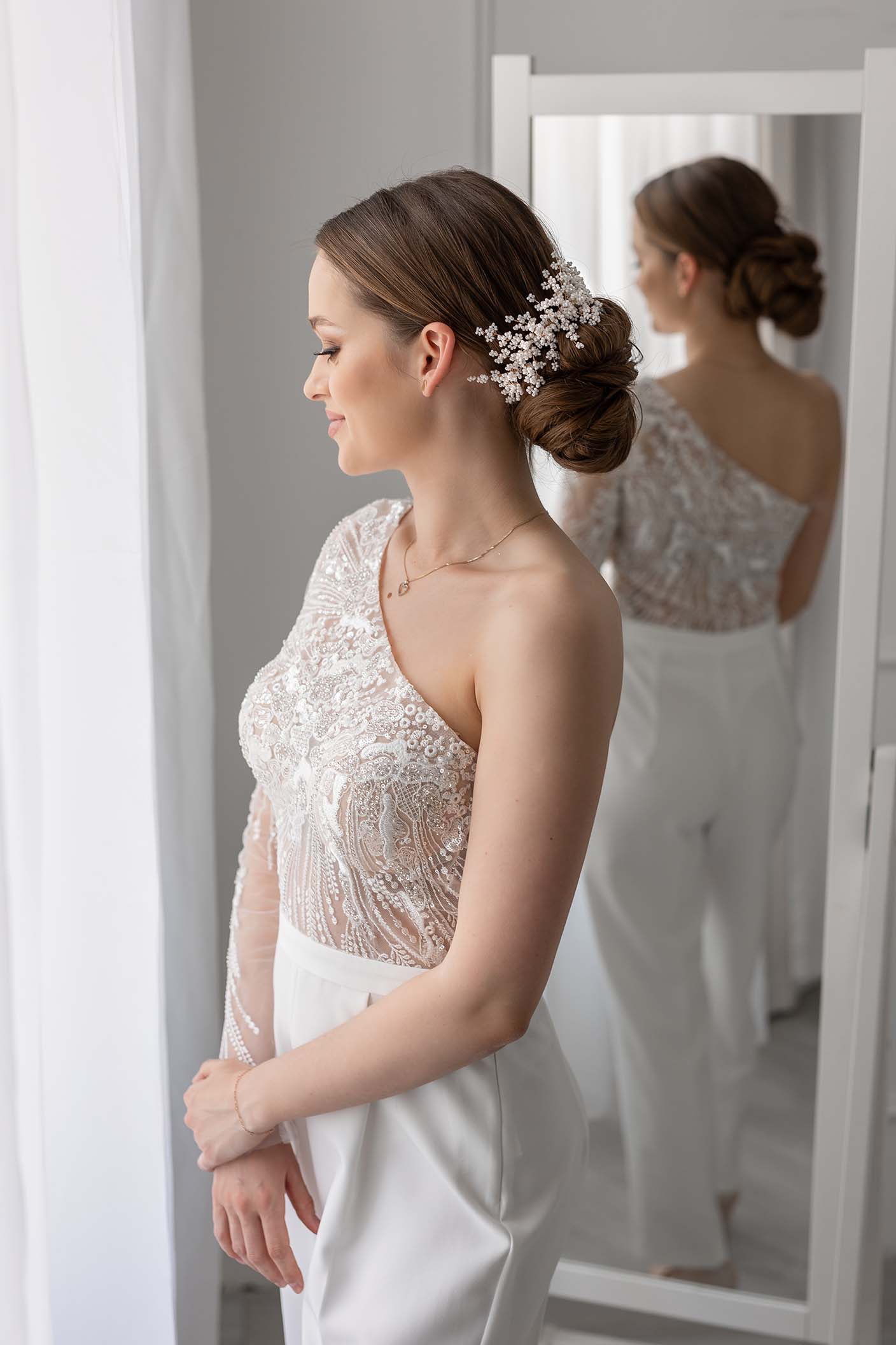 Az Elena fésűs hajdíszt a rezgő virágok ihlették, amiket több, mint 1100db apró Preciosa R üveggyöngyből lett megformázva. Ez a hajékszer mint ahogy a rezgő is, a visszafogottságot és egyszerűséget képviseli, így olyan menyasszonyoknak ajánlom, akik ezt a stílust keresik.